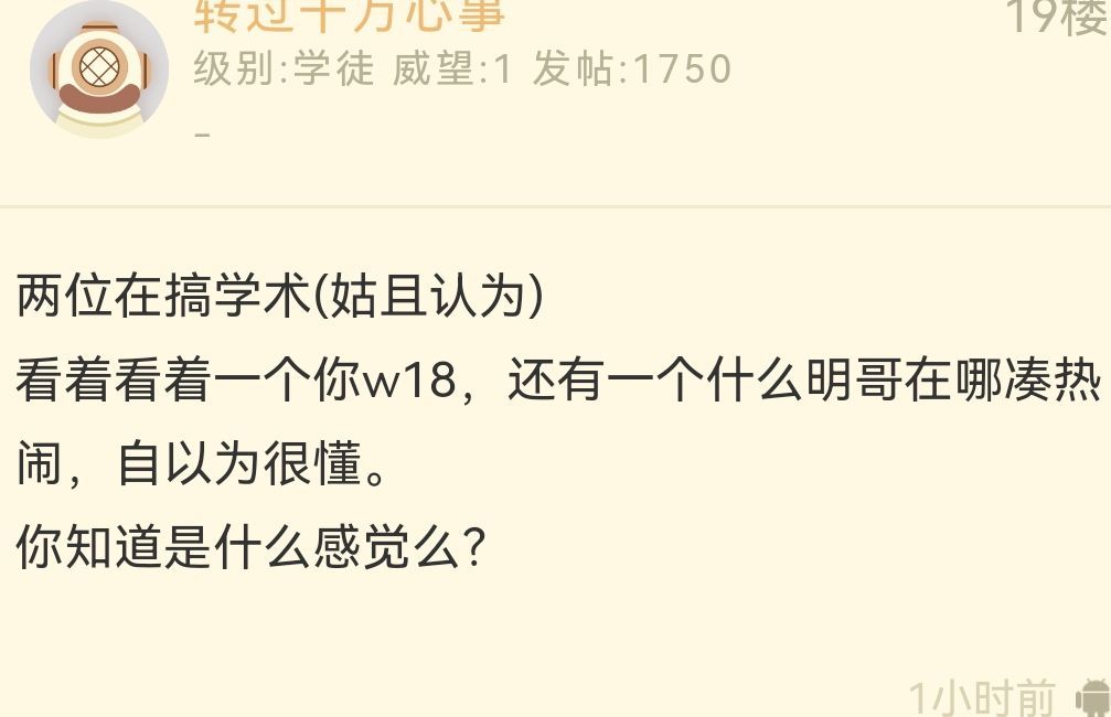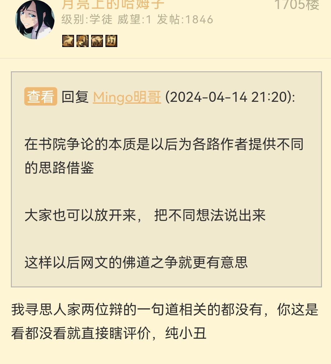 结果粉丝就不允许别人发道家的内容了,而且那个楼只允许辩经者发言,不懂经的在那个楼讨论发言就是小丑/不知廉耻/破坏书院讨论氛围。