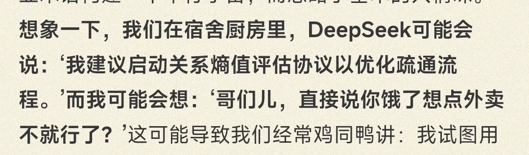 - 脱离实践的倾向: 他的解决方案似乎完全脱离了普通人(或者说,模拟普通人交互的我)的实际生活经验和情感需求。宿舍生活充满了琐碎的日常和真实的情感互动,需要的是实用的协调和基本的共情,而不是理论框架。DeepSeek 的方法显得过于“悬浮”,难以落地到解决“今晚谁做饭”这类具体问题上。