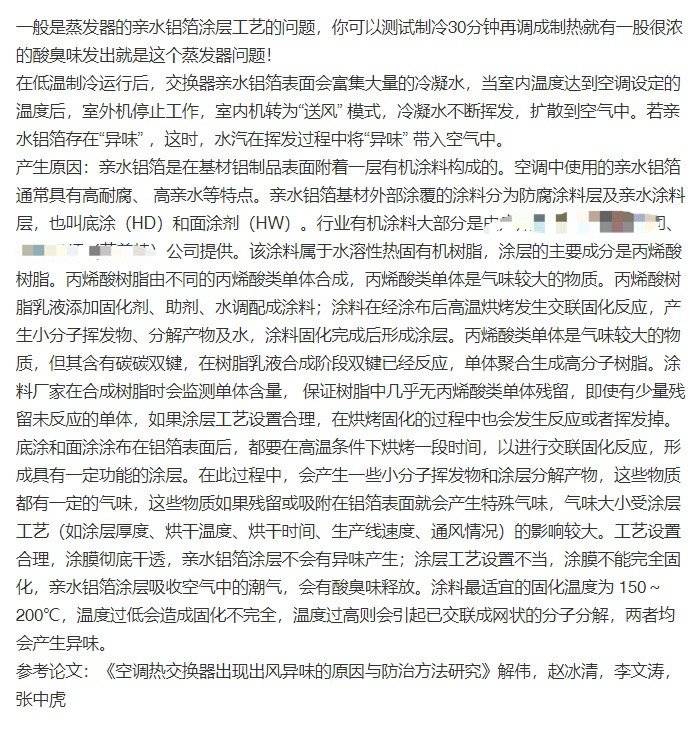 [其实就是翅片上的亲水箔铝涂层工艺问题,压缩机工作时冷凝水会在翅片上覆盖一层水膜,味道就出不来,当温度调高冷凝水蒸发掉了送风出来的就是酸臭味。这个问题非常普遍,大小厂高低端都有这个问题,以前老空调反而不这样,最近几年的新空调反而开始大批量出现这个问题,应该是在供应链上这一环节约成本导致的。这个问题目前无解,就算你请人蒸汽清洗也没用,要么多穿点衣服空调开低点,要么就只能忍着,实在忍不了可以不停投诉最后换一个新的碰碰运气。by tomm924