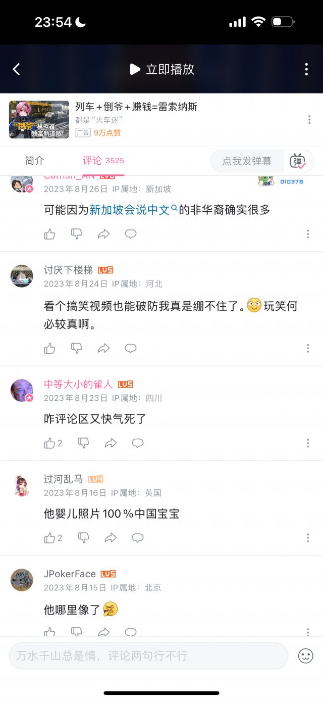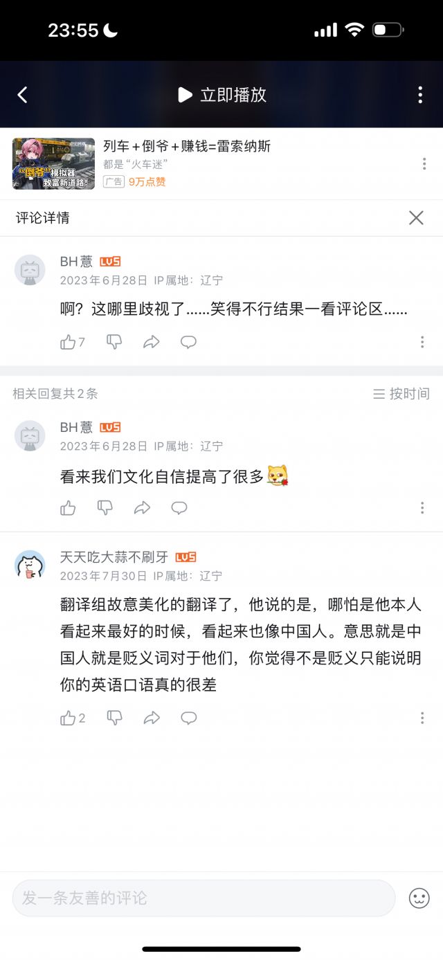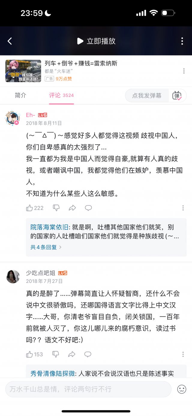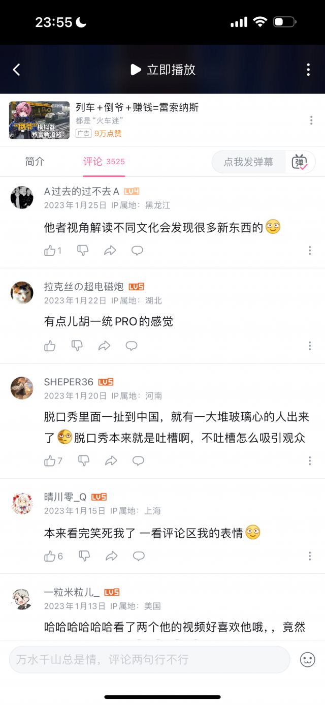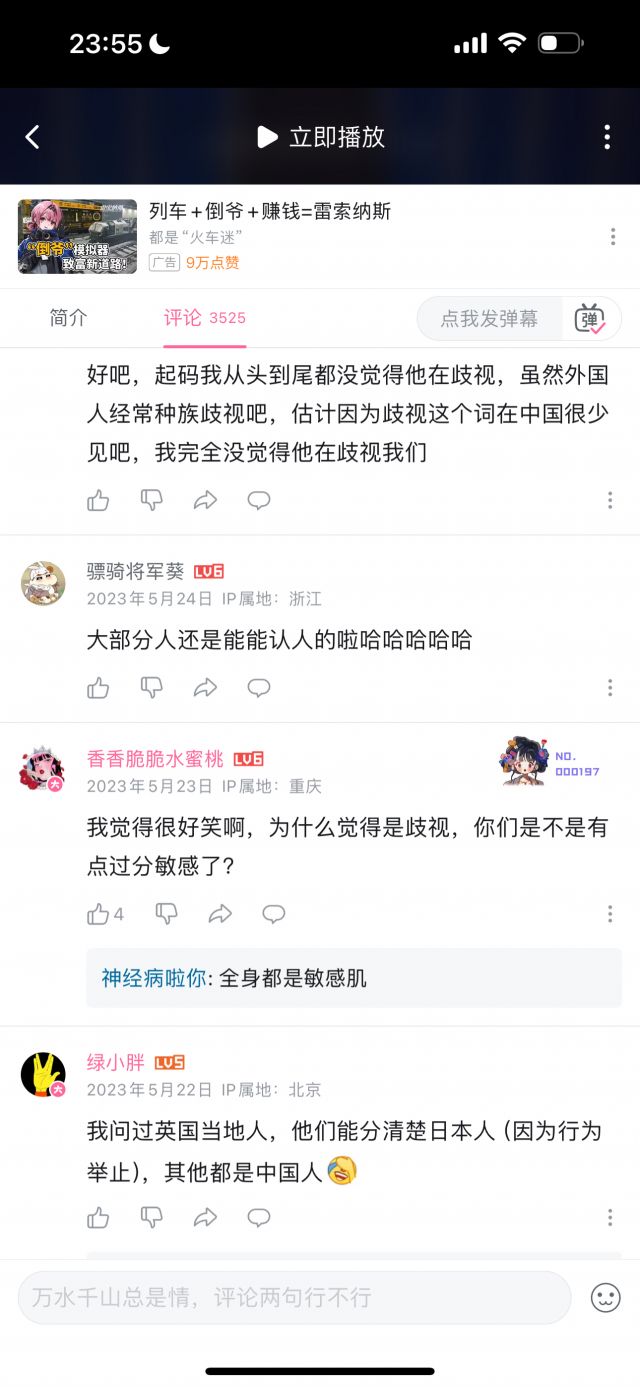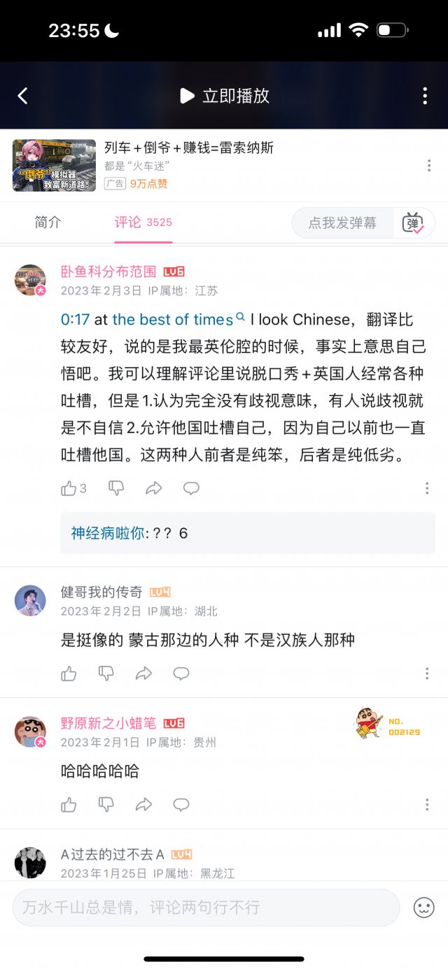 但我统计了数十条评论,压根没有找到几条是能体现“玻璃心”的,玻璃心的评论,和讽刺玻璃心的评论的比例,可能不到1/100,即使部分“玻璃心”评论可能被举报删除了,但这个比例依然极为夸张,按时间排序,近几个月依然有大量评论在乐此不疲地对着国人的玻璃心一顿输出,但我按时间排序,手都翻累了才终于找到一条评论是在表达对于这名英国人的言论不满的。