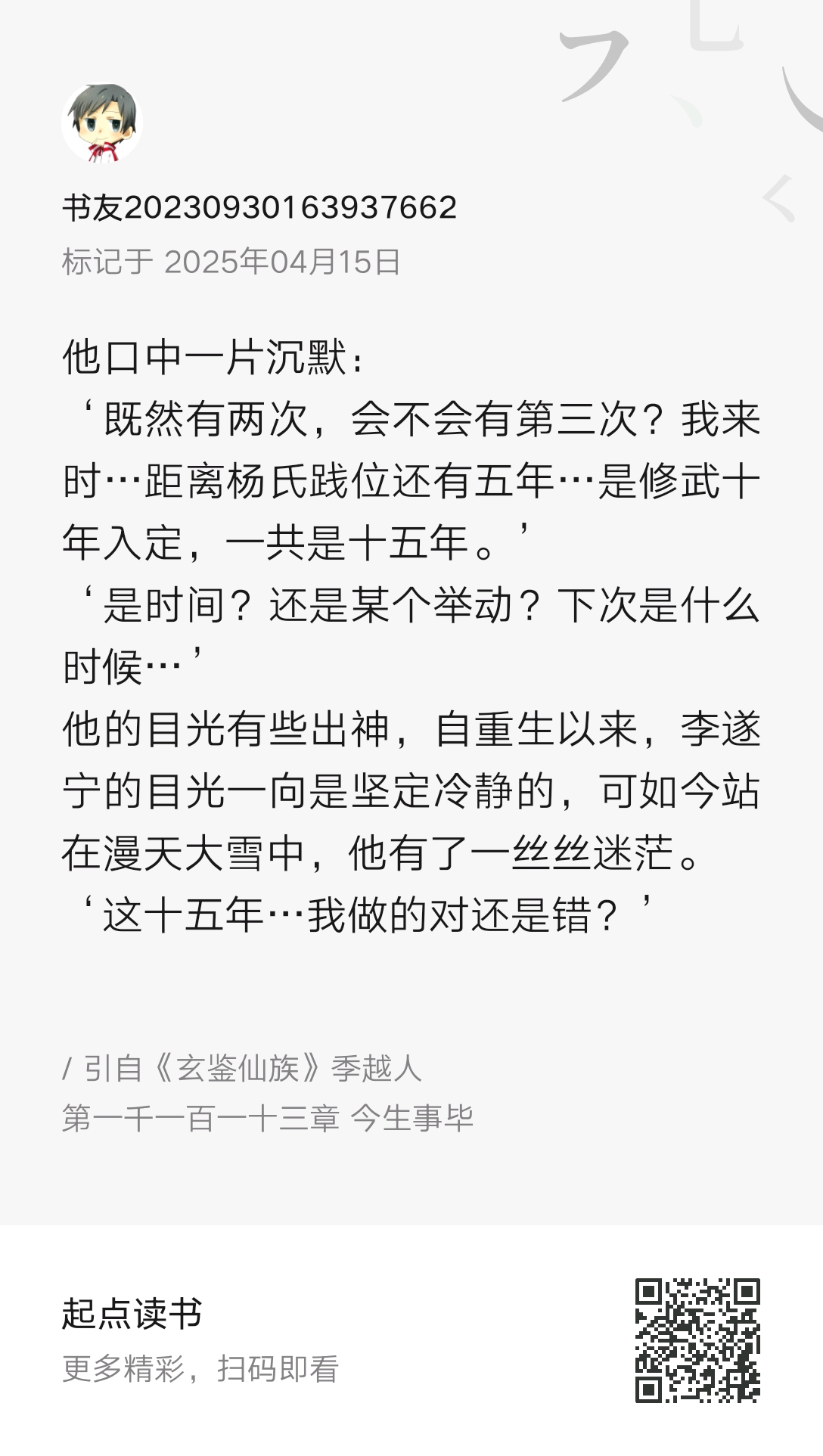 而团灭的原因就是因为某一个无法改变的节点,于是用某种手段一发狠来一个大穿越,穿回了久远之前,自己成了司天金丹玄谙,也解释了为啥玄谙现在状态并不好,也不出现,并且对李家种种奇怪的现象视而不见,还能被外界大能忌惮。