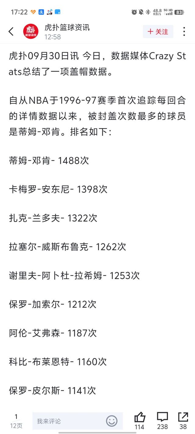 今日,数据媒体Crazy Stats总结了一项盖帽数据。