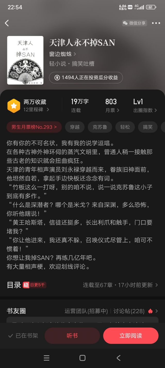 个人觉得是潜力新书,剧情不拖沓,开局几章就解决了一个事件,干脆利落地引出了本书看点。人物方面刻画也很不错,我对书里的小虎印象最深,现在脑子里全是“逗你玩儿”“掰掰”……总之,诚心推荐此书,真的很乐