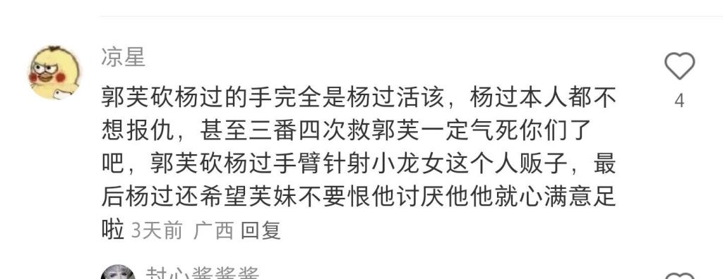 实际以杨过的性格,对郭芙的容忍,如果不是爱情,我都难以解释,对砍了他一条胳膊,银针害死小龙女(当时来看就是害死了)的人,能如此克制
