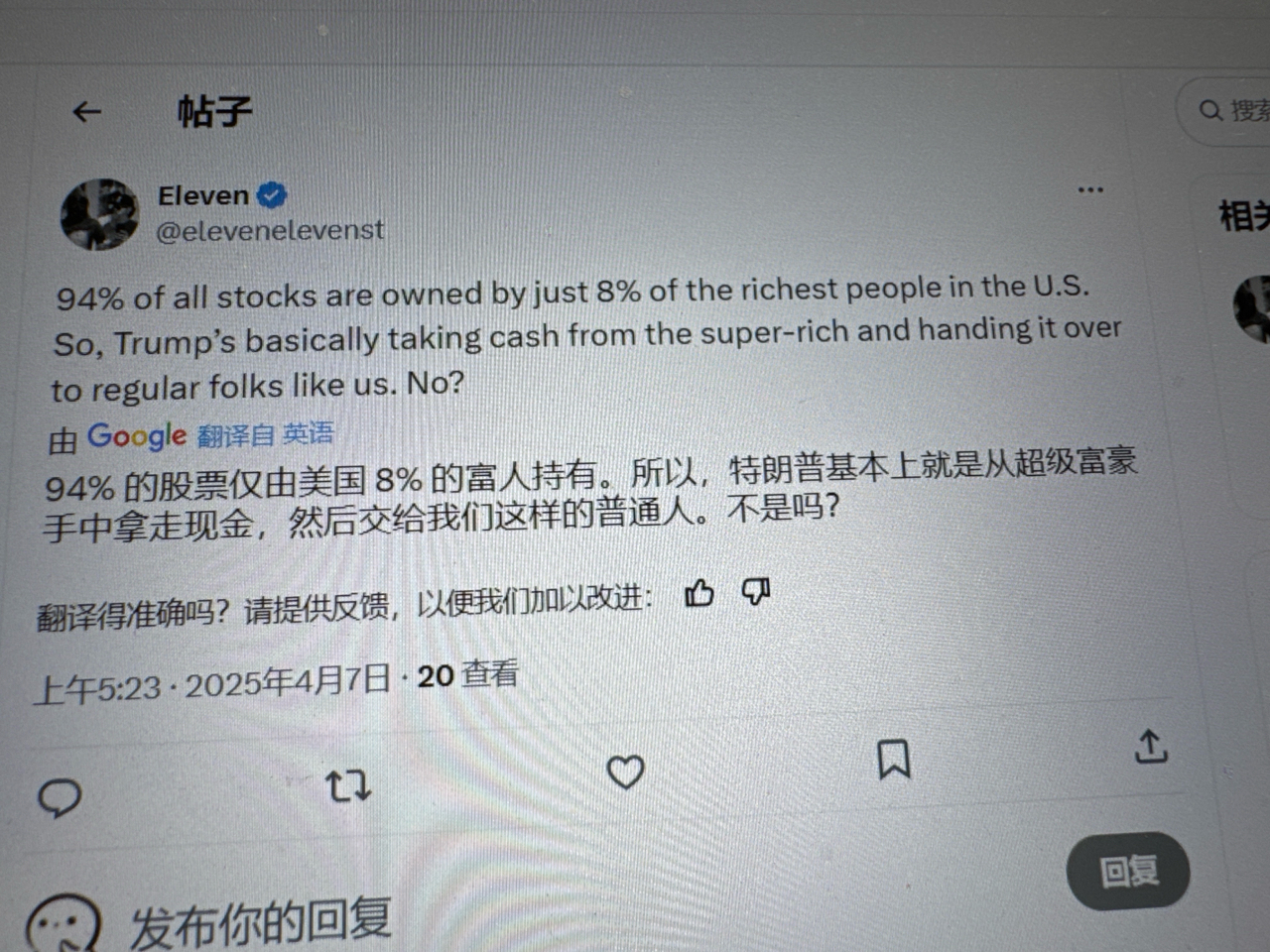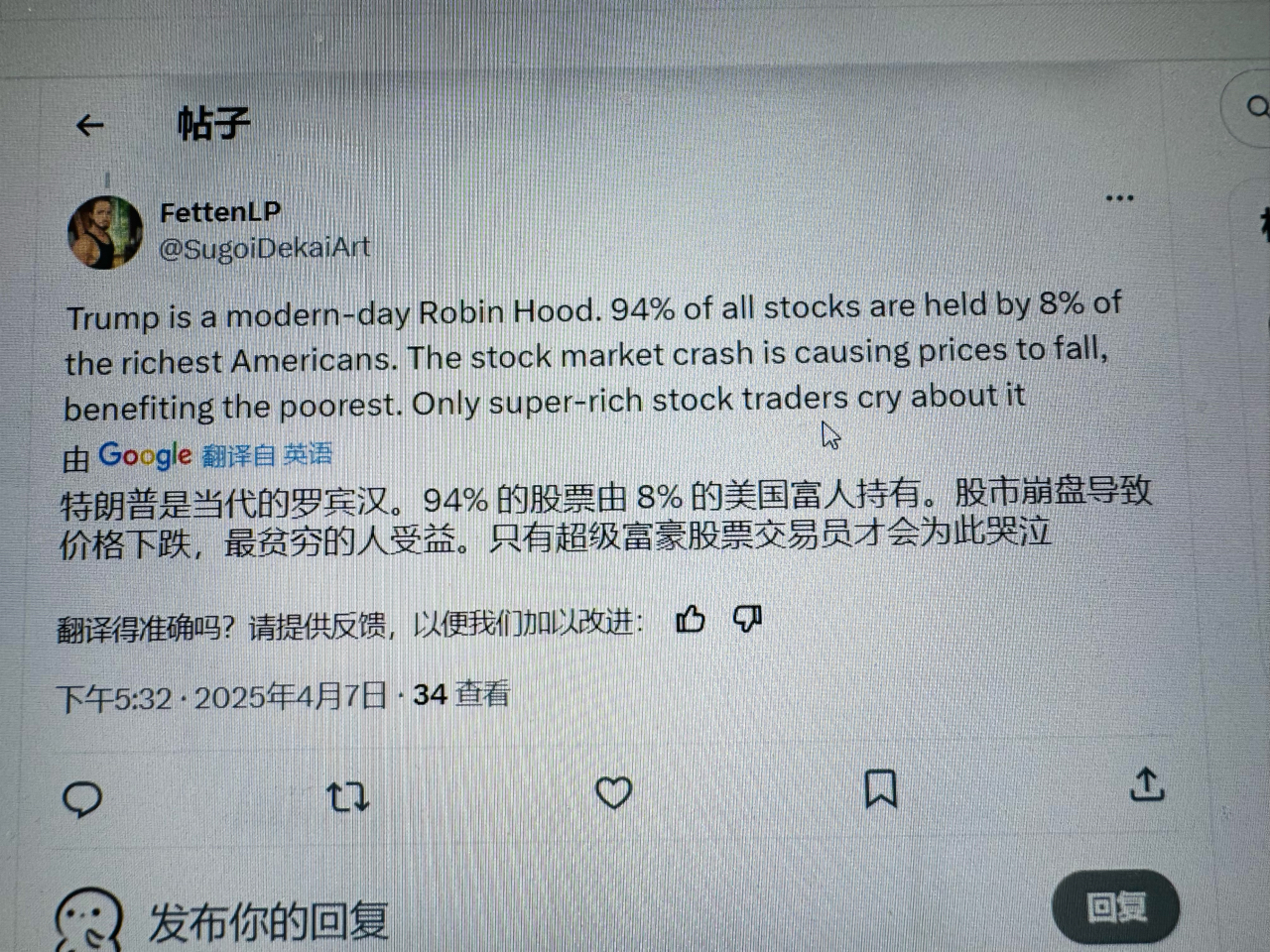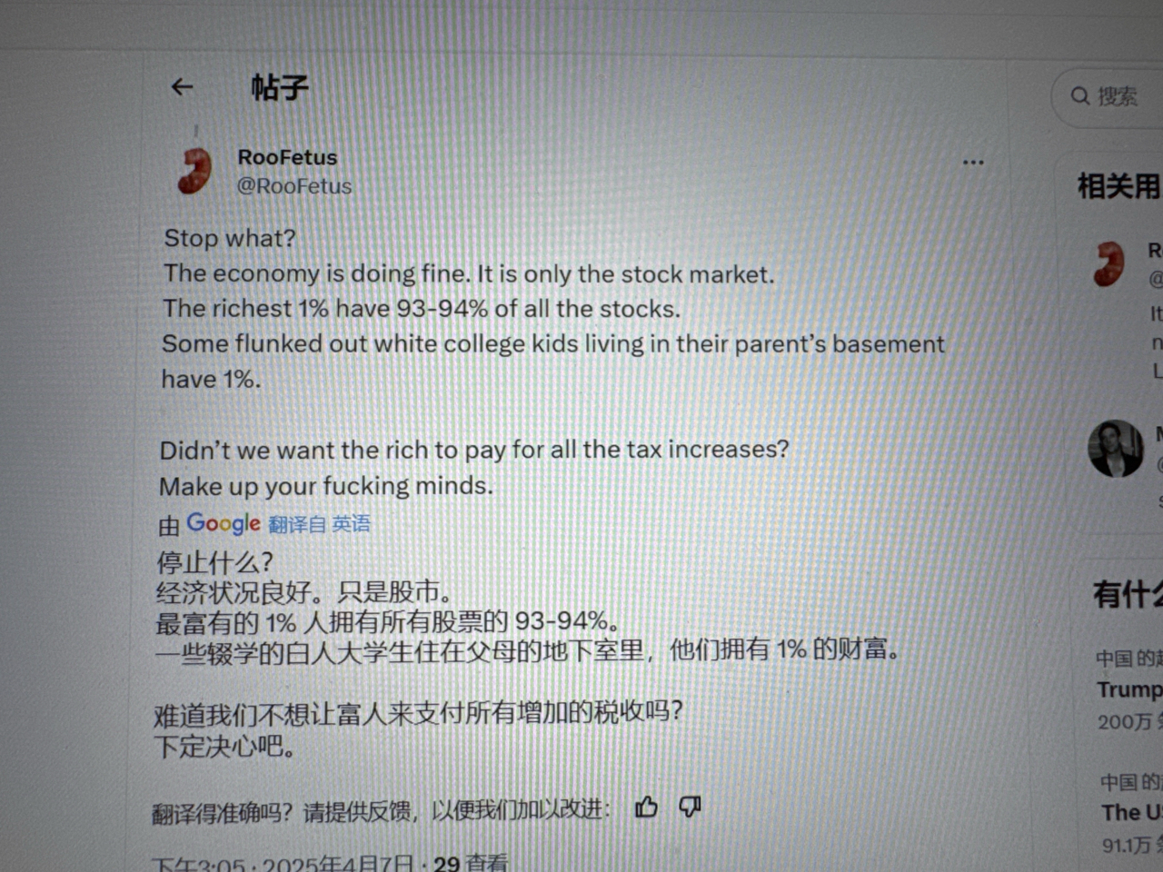 美股跌了—-有钱人失去了他们的钱——联邦zf靠关税收到了钱——zf拿钱投资/救济/支援 中低收入者