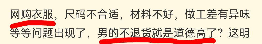 网购衣服,尺码不合适,材料不好,做工差有异味等等问题出现了,男的不退货就是道德高了?这明明就是龟训。有问题就将就,那权益咋保障?还tm天天用道德绑架自己,你高尚有个der的用,商家只会笑话你是傻逼。