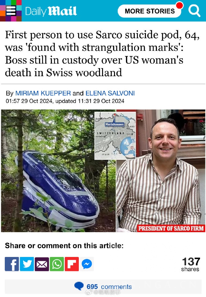 这报道说的应该是,死者实属被别人勒死之后放进了那个安乐死自杀舱里,伪装成死者使用这个安乐死舱自杀的意思吧?