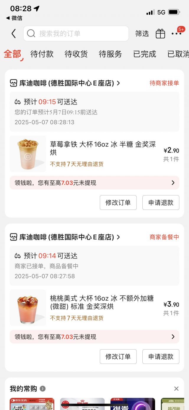 早上点了两杯库迪,一杯1.9加1元打包费,另一杯2.9加1元打包费,送来之后还一杯超时自动免单给退款了