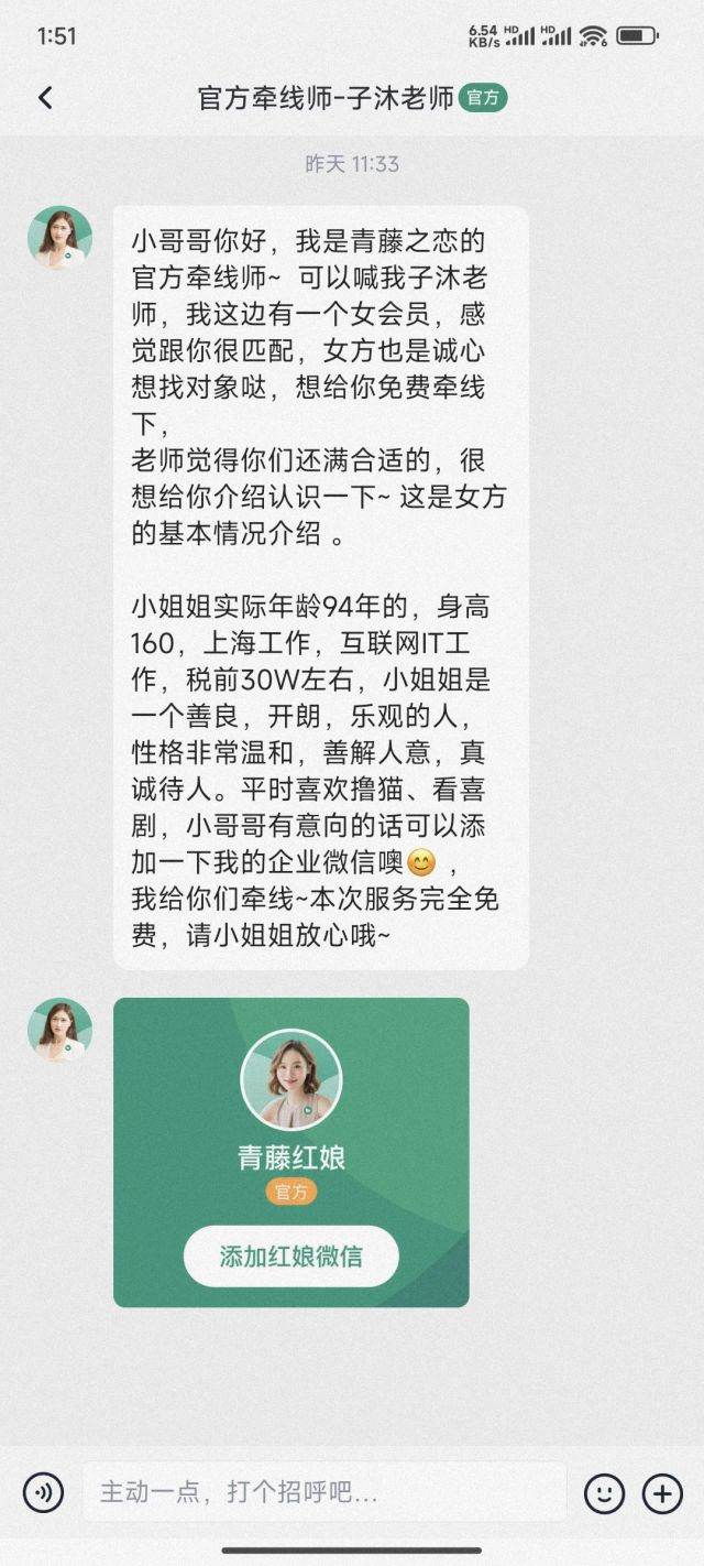 于是,给出去的微信大半天过去了都没有小红点。突然拉了个群,我还想着挺高级啊~两个红娘辅助一个VVIP在线群聊,不过这样真的合适吗不是我们私下聊?