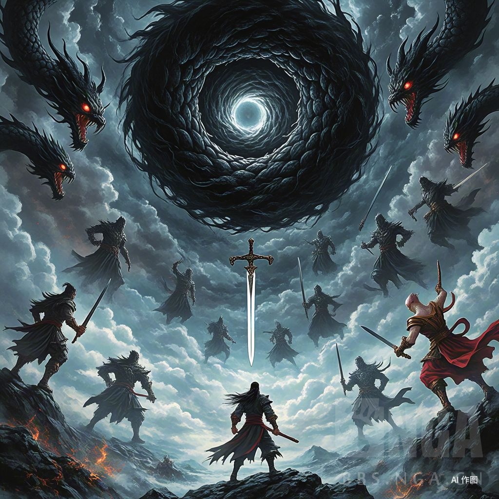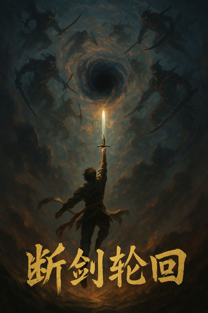 小说名字暂定叫断剑轮回,封面元素包括一个男主,手持一把宝剑,这个时候断剑已经重铸是一把完整的宝剑了,男主手拿宝剑从下面冲向天空。天空正中的地方是一个黑洞,黑洞的周围有一些魔修,用刀的用剑的什么。