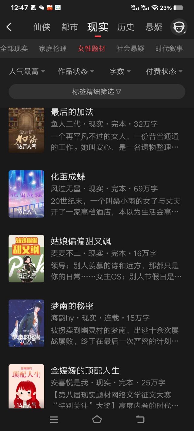 男频的现实有女性题材,女频反而没有,真是现现又实实阿