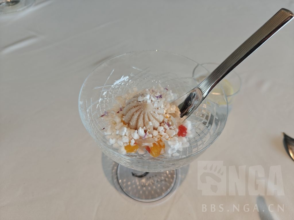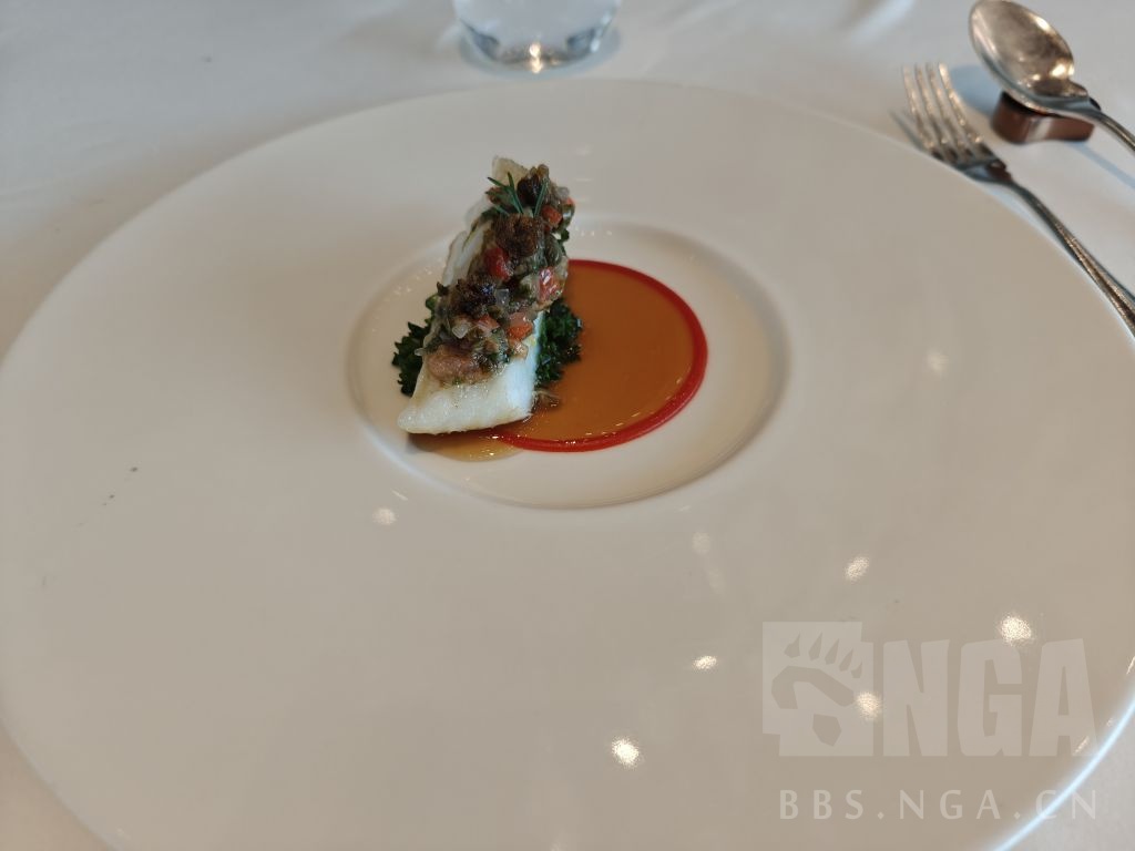 帝王蟹,番茄为底的酱汁,酸奶雪葩。蟹肉明显的甜,加上旁边的香辛料和酱汁,整体上还是和前面番茄挞一样的开胃菜的感觉