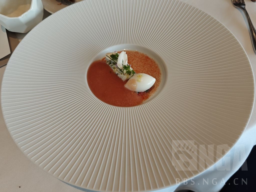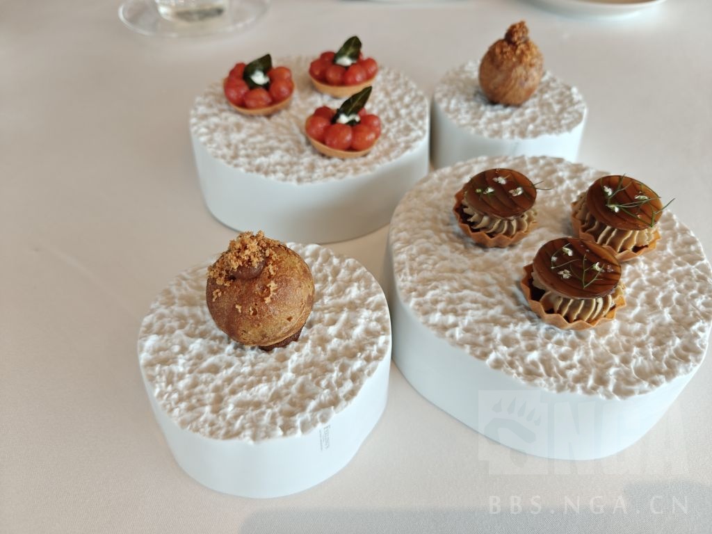小菜的顺序是西红柿挞、鹅肝慕斯和芝士球,西红柿恰当的腌制在保留了足够汁水和清爽的同时带上了一点咸味,是合适的前菜但是这个味型在后面会多次出现