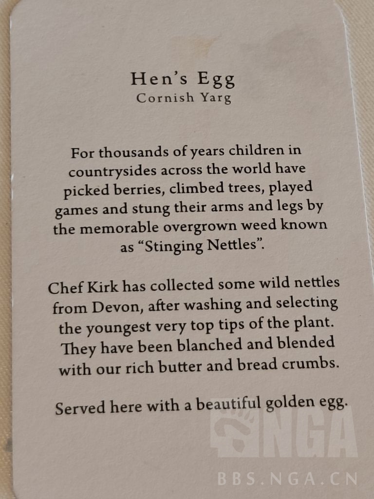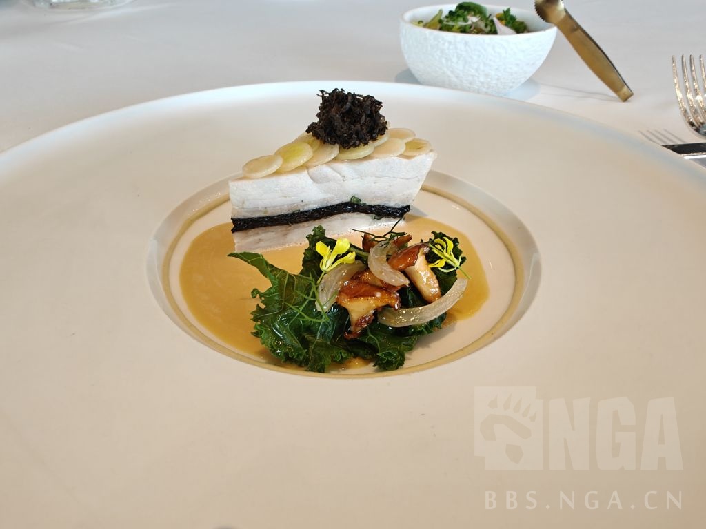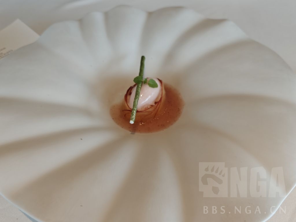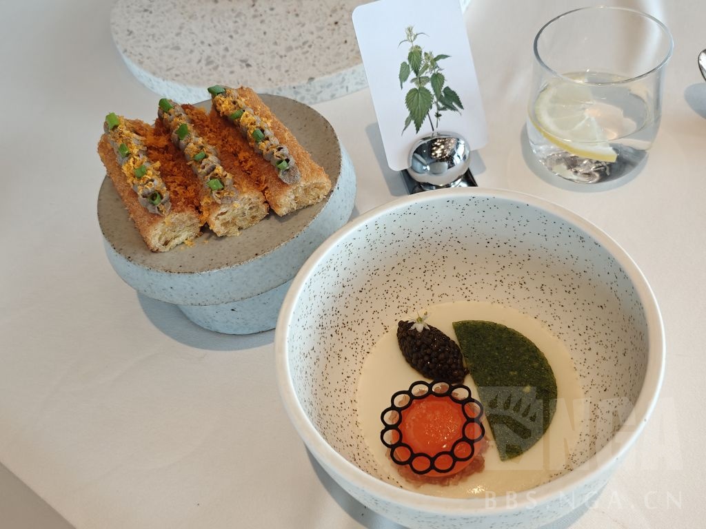 招牌菜有机蛋,蛋白慕斯,蛋黄配巧克力片和腌制西红柿,鱼子酱,荨麻,配菜是油条(请原谅我匮乏的知识和词汇)和咸味的慕斯。本身基础是动物性的香气同时用鱼子酱来吊咸味显得鱼子酱和蛋黄的味道有些冲突,但这个油条能压得住鱼子酱,整体上是非常复杂的咸香,的确很有特色。荨麻......没存在感,单独试了一下也没味道