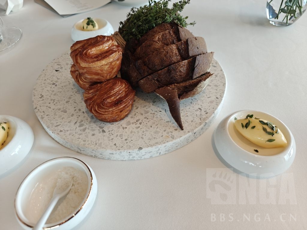 面包,自制黄油加上香草、盐。能够感觉到的确是超规格的黄油,动物油脂的香气和不知是不是调过的咸香非常突出。酸面包本身是烤到有点发苦,和黄油很搭。旁边的小面包也能感受到是加了足量的黄油,外酥里软