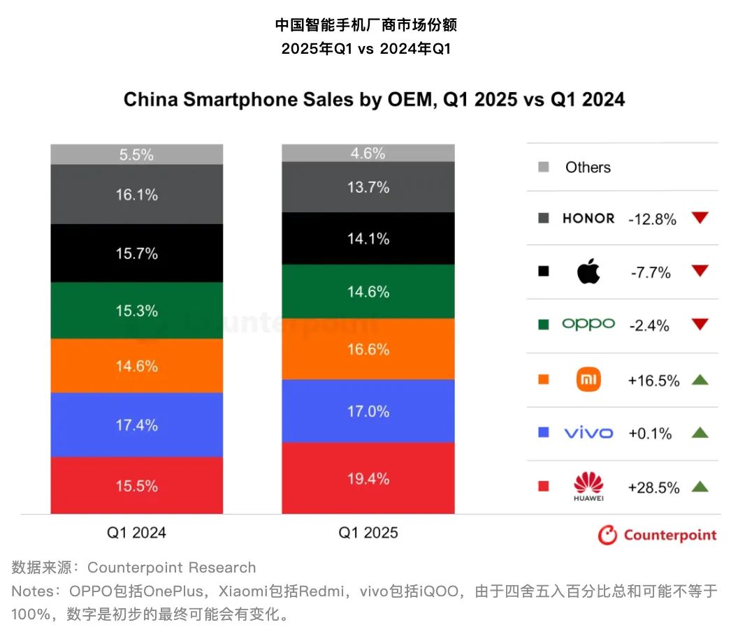 金十数据4月27日讯,4月27日,Canalys最新数据显示,2025年第一季度,中国智能手机市场出货量达7090万部,受到国家补贴政策提振及消费复苏推动,同比温和增长5%,延续了自2024年开启的复苏趋势。其中,小米出货量达1330万部,同比增长40%,时隔十年重回第一,市场份额19%。华为紧随其后,依旧维持双位数增长,出货1300万部,位列第二。OPPO、vivo分别以1060万部和1040万部的出货量位列第三和第四。苹果在其传统旺季后出现下滑,出货920万部,同比下跌8%,排名第五。(金十数据APP)