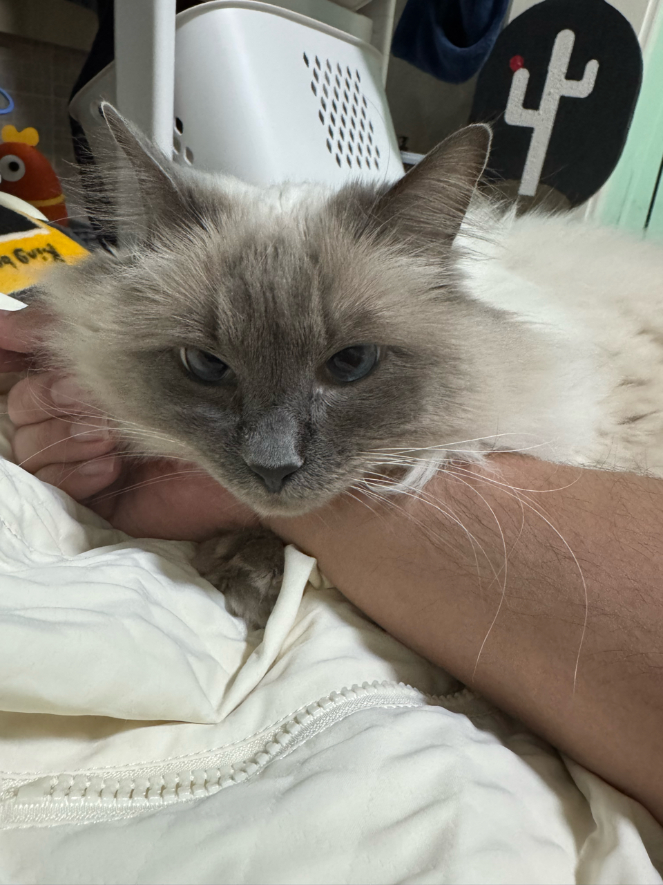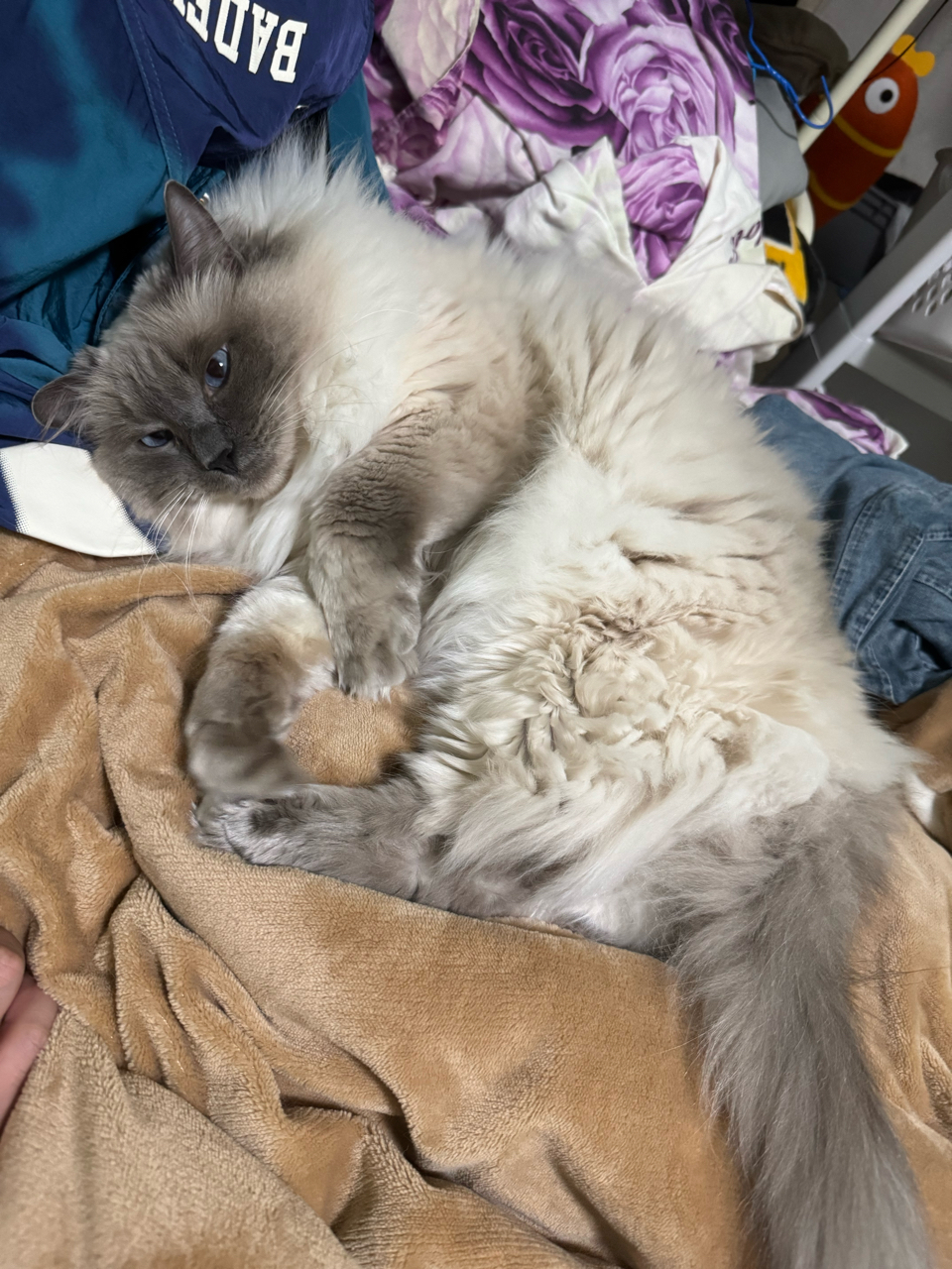 重点色布偶猫,年龄不明,绝育公公,未体检(但看着十分健康,吃喝拉撒睡均正常),对人极度友好,喜欢和人贴贴到半夜要顶你的头睡一个枕头的程度,对猫友善(没哈过原住民,俩猫也不打架),只能说性格好到像只假猫