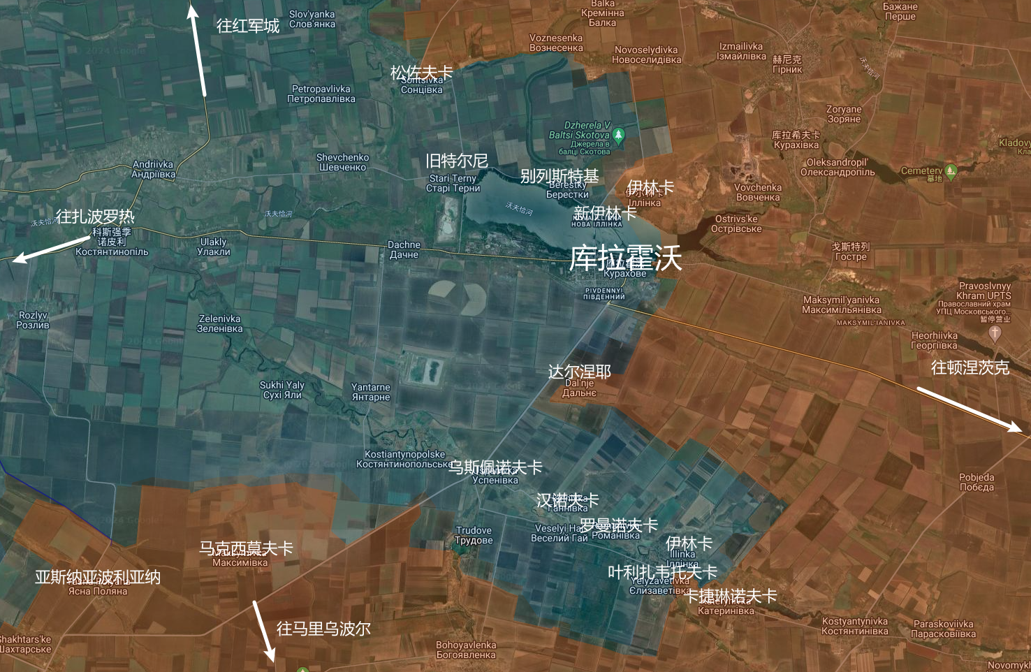 在城市北部,卡察普人(乌克兰境内对俄国人的一种蔑称)不断尝试在村庄松奇夫卡(松佐夫卡)立足并完全占领它。他们也在向新谢利迪夫卡(新谢利多夫卡,实际上已经由俄军完全占领)施压,但库拉霍韦北部的主要关注点集中在别列斯特基-伊林卡一带。我们昨天写了一篇关于这两个定居点的帖子。尽管上级收到的报告真假掺半,伊林卡确实被占领了,并且已观察到少数俄军步兵出现在别列斯特基附近。俄军在此区域的目标是推进到旧特尔尼(位于库拉霍沃水库西岸,拱卫库拉霍沃的西大门)。