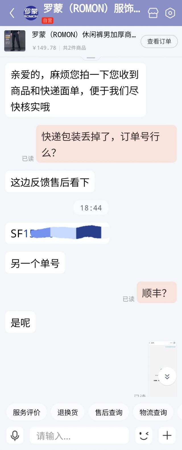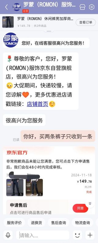 自营店买两条裤子,可以看到商品页面明确显示“京东物流”,结果京东小哥只送来一条裤子,订单显示完成了。我还以为小哥落下一条在他快递车上,联系快递小哥,小哥和我比较熟,他明确表示确实只有一条裤子,如果有问题应该是商家发货的问题,然后我联系商家,商家告诉我另一条发了顺丰。。。。从来没见过的操作。。。