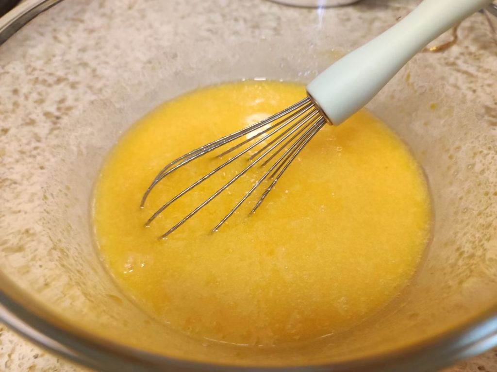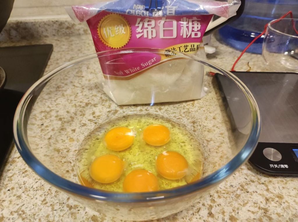 接下来在融化黄油巧克力期间,把鸡蛋和糖凉拌均匀(图中糖用了150g,因为我巧克力是80%的黑巧克力,所以糖少加了点)