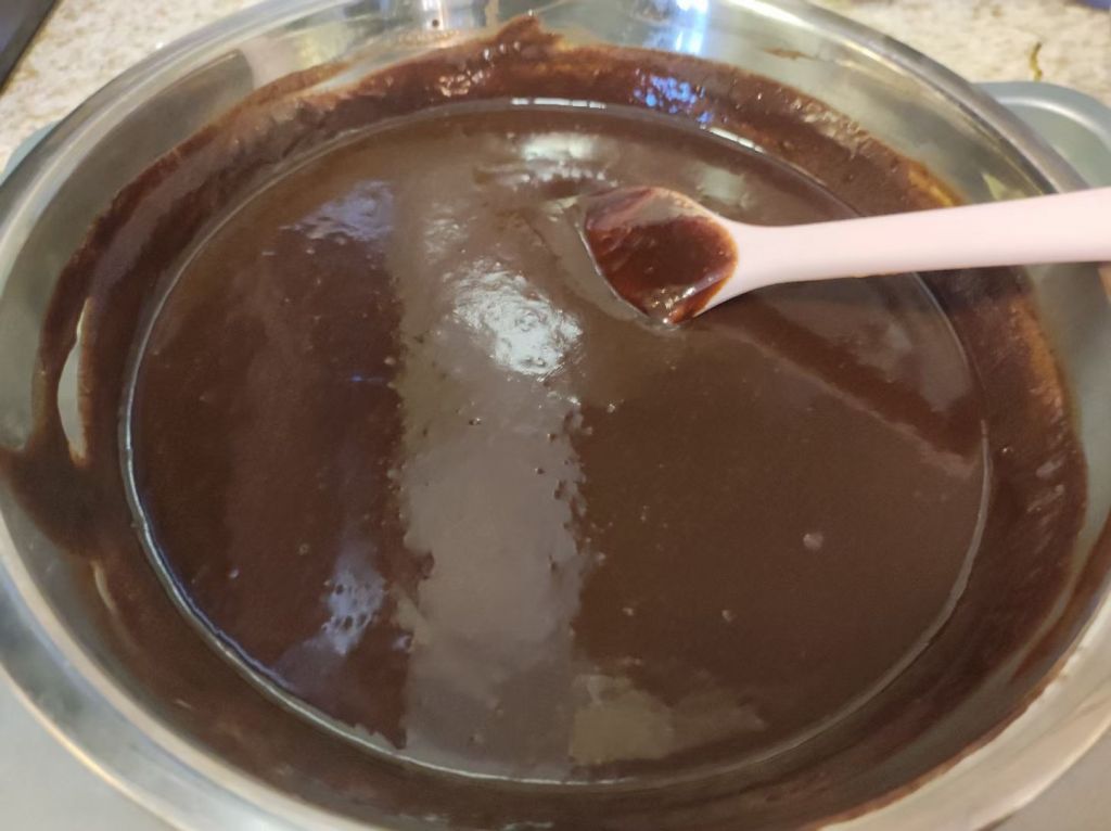 待黄油巧克力融化后,加入鸡蛋糖混合液拌匀,注意!重点来了!!在加入鸡蛋糖混合液时一定要边加入边搅拌,或者加入后迅速搅拌,不然鸡蛋部分接触面熟透后会影响口感