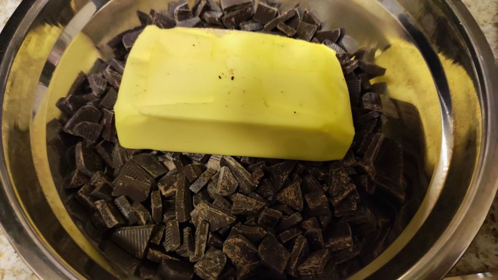 首先隔水融化巧克力和黄油(把黄油和巧克力都切碎点更方便融化),切记一定要隔水融化!不然容易糊