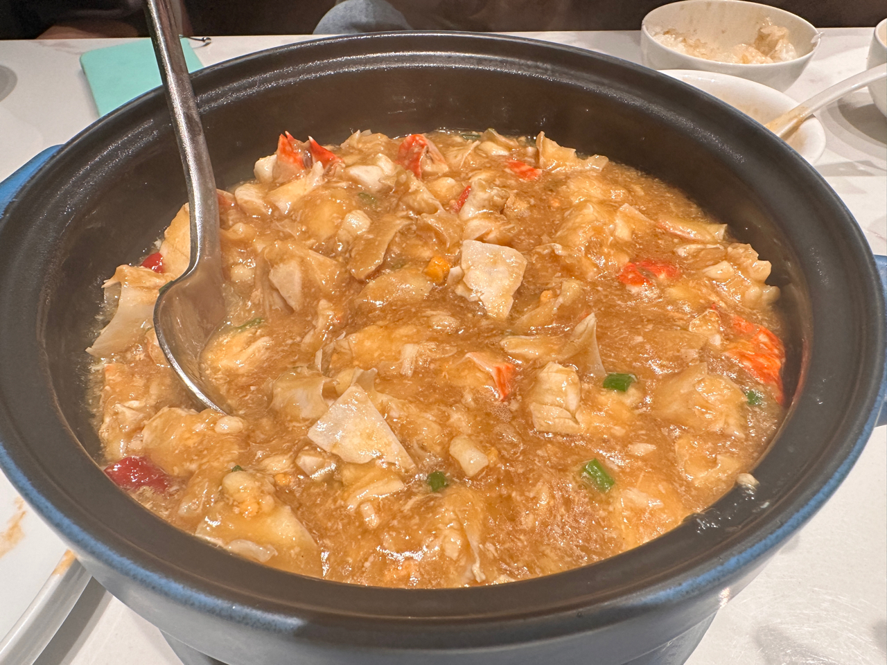 类似于扬州炒饭的做法,不过没有那么多的高汤,主要用蟹油和蟹粉来出味,蟹肉和黄增加口感,用煲炒出来的比较干,导致下层的米就显得很油,整体上还是非常好吃的。