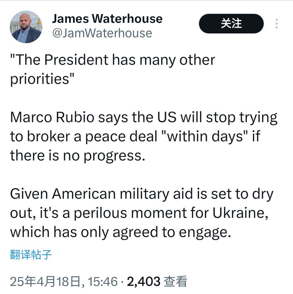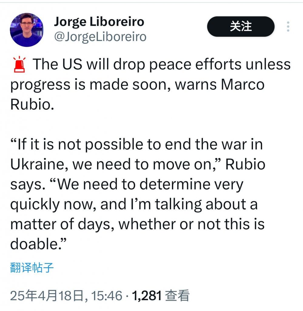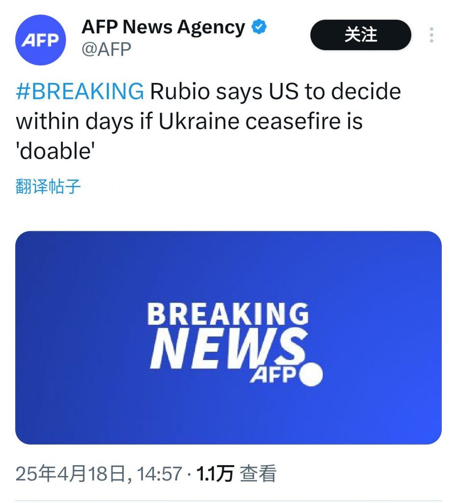 美国国务卿Rubio表示,如果在几天内无法促成俄乌停火,特朗普政府将会放弃继续斡旋停战。