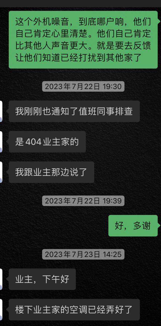 事件经过:今天下午16点左右,物业过来敲门。开门说接到投诉说这边空调外机太吵影响到对面楼睡眠。