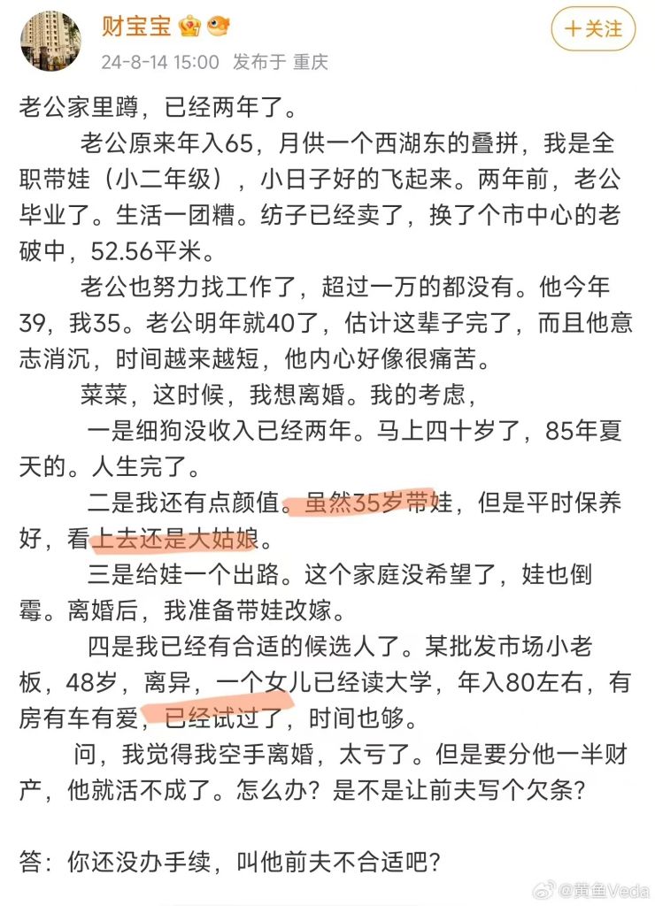 然后也有部分男的开始讲道理,但女方就死咬生育做家务衰老婆媳关系这些,然后男方一听到孩子就不想争了,