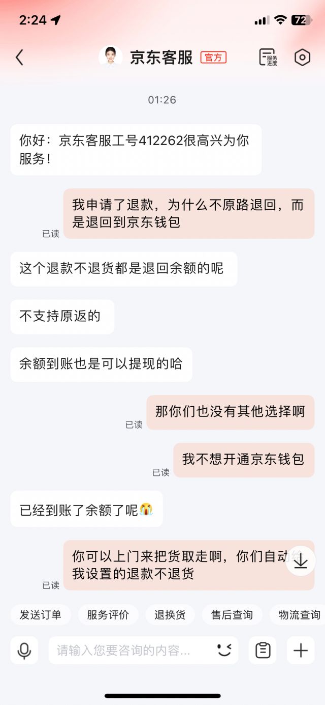 就在刚刚我才发现,京东竟然不是原路退款,而是退款到了自家旗下的金融产品京东钱包,不经过实名授权还无法提现。这不就是变相的拿退款做未经本人允许的投资吗?