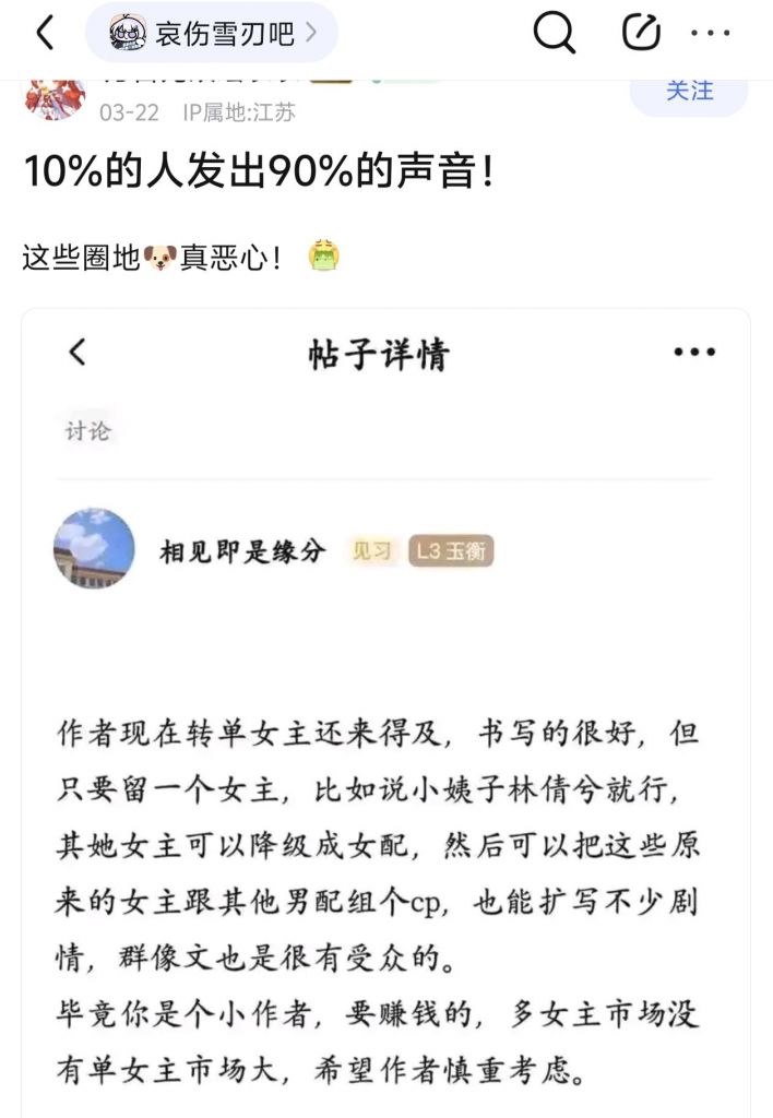 一个看后宫文以及扫雷的吧居然能堂而皇之把wb话术用的如此熟练不说,自己看着后宫文自己却自我贬低一遍,自我切割后宫纯爱,自我贬低自己的爱好,仔细思考wb规训话术的道理来自我规训。为的仅仅是那虚无缥缈的可怜优越感。 (而这个优越感的简单描述就是: 虽然我也喜欢看后宫文,但我和你们是不同的,我可是知道这个是不真实的,是不高级的,“进步人士”和wb大大们这下能高看我一眼了) ,在那扯什么换位思考的,请问wb鲜女们看霸道总裁,川普爱上自己的时候考虑过换位思考吗?看个男频后宫文娱乐也要考虑和wb换位思考,这种高道德劣势其实正是不断的被wb蚕食的根本原因之一。