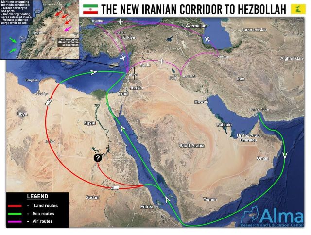 以色列军方资助的智库“阿尔玛”(Alma)发布了一份信息图,指控伊朗正在利用秘密路线向真主党提供武器。报告称,伊朗利用途经土耳其和伊拉克的货运航班,以及经由苏丹和利比亚向地中海走私武器。据报道,这种方法允许伊朗通过运送武器部件而不是完整的系统来绕过黎巴嫩的检查。