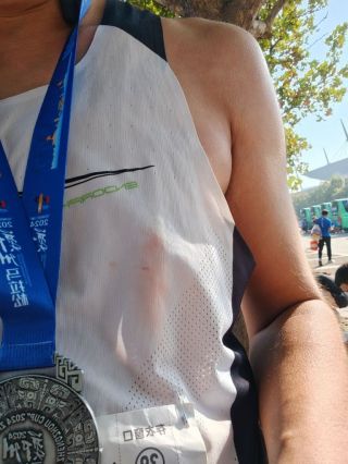 中年人第一次半马 半路胸贴汗透了,不沾了,我挠两下掉了