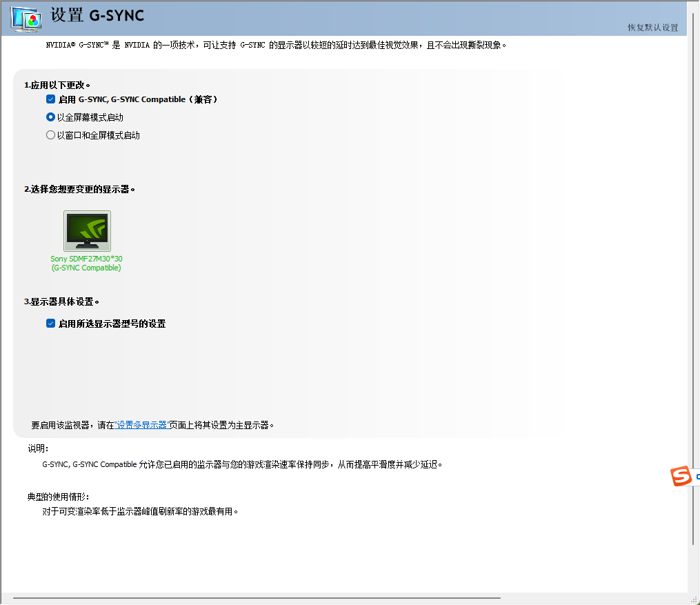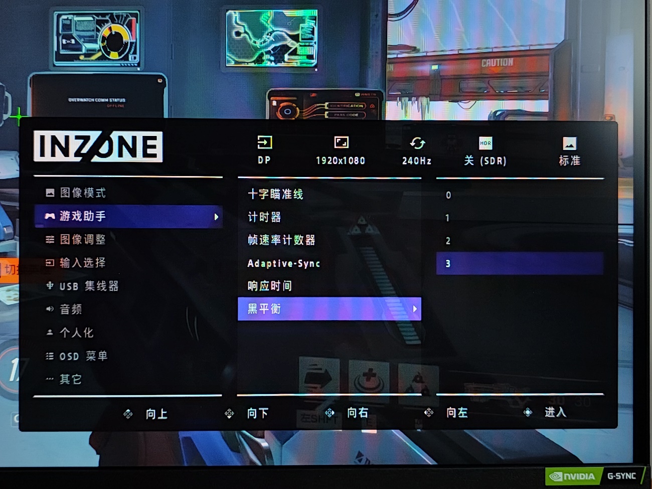 adaptive sync需要在OSD菜单中进行开启,然后打开英伟达的控制面板,就会看到该选项,该功能只能在DP模式下能开启,能有效的防止游戏中画面的撕裂,相当于自适应同步,不过开启该技术就不支持1ms模式,根据自己需要选择,个人基本选择不开,对于玩动作类游戏,画面切换不那么快的游戏还是有用处的。