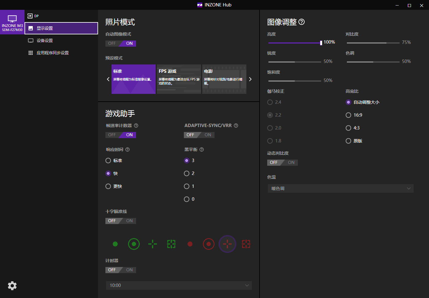 INZONE Hub可以进行单独的个性化设置,并且可以保存为预设置文件,当用户进行重新装机系统的时候可以进行快速的恢复,不过里面并没有色域缩限的设置,INZONE Hub整体的使用是十分方便的,可以设置为开机自动启动,里面的各种设置项一目了然。其大致的功能和OSD菜单基本一致的。包括图像模式、显示模式、帧率计数、响应相关、十字瞄准、VRR刷新率和Adaptive-Sync,图像详细,接口设置、节电设置以及音量相关等。