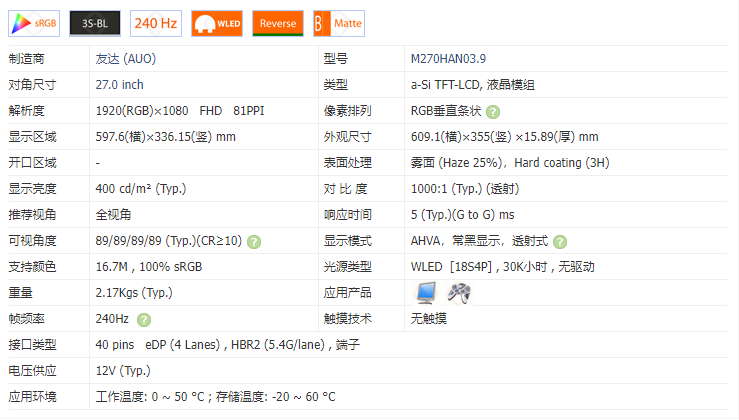 进入工程模式INZONE M3的面板采用友达M270HAN03.9,尺寸为27英寸,并采用原厂背光。官方标定为侧入式背光,以及HDR400和低蓝光认证,色域值为99%SRGB,10bit色深,240hz刷新率,VRR自适应刷新率和Adaptive-Sync自适应同步,1ms GtG响应。