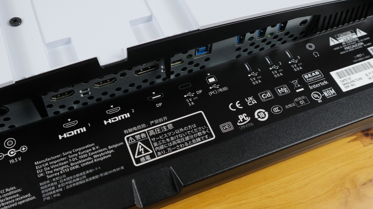 接口方面INZONE M3非常的齐全,DP1.4 x1、HDMI 2.1 x2、USB Type-C x1 (DP ALT模式、上行)、USB Type-B x1 (上行)、USB Type-A x3 (下行)、耳机输出口 x1 (3.5mm),这9个接口完全满足所有的用途。