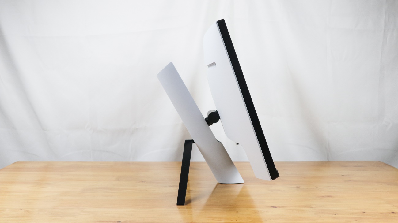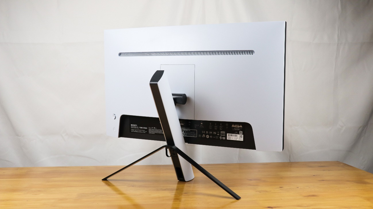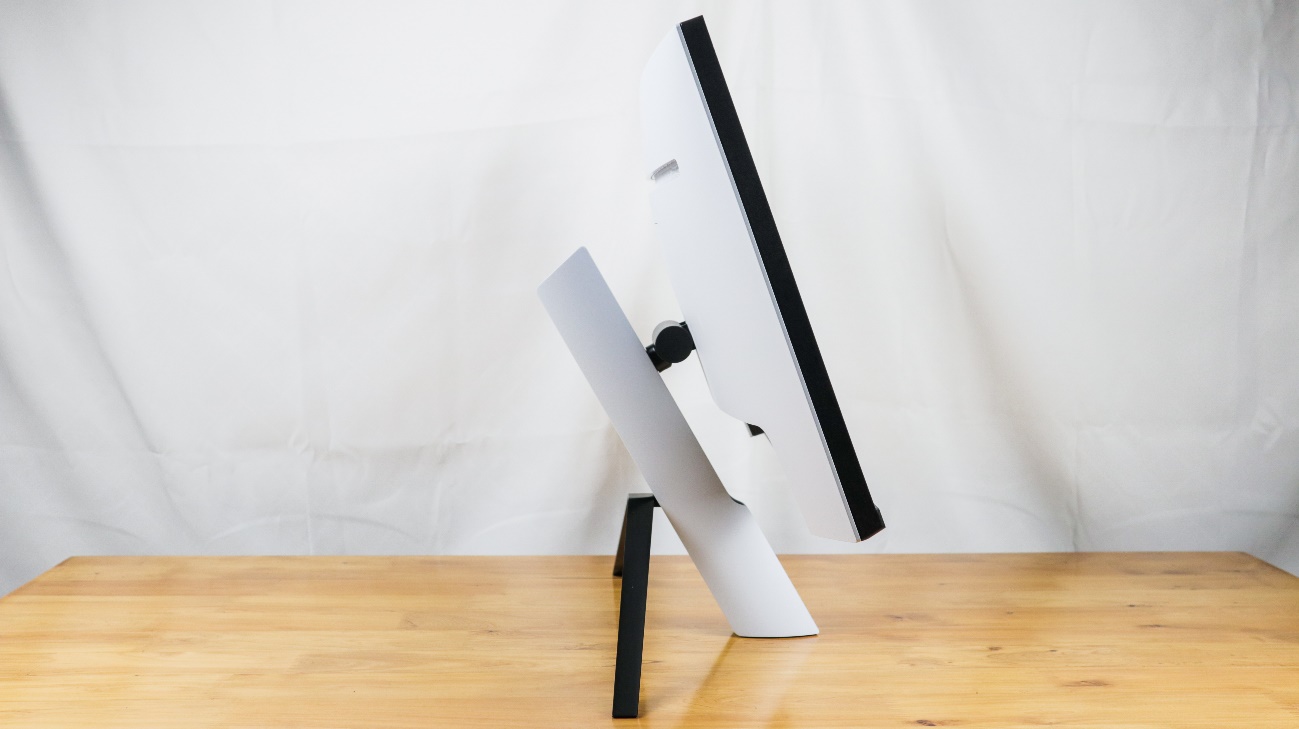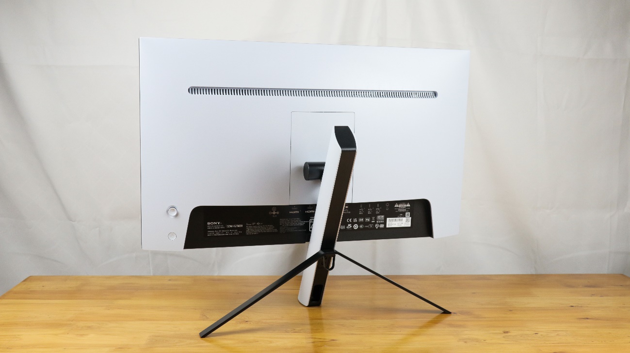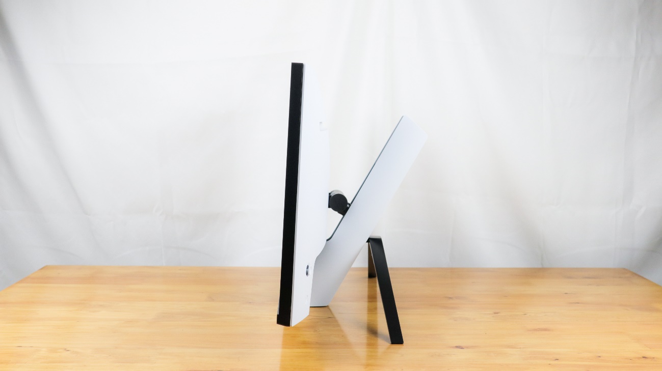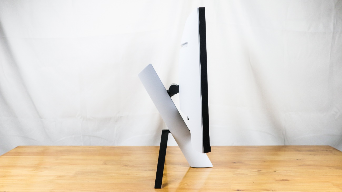 支架M3和M9一样,依然是三个角的支架,支持俯仰不支持旋转,依然是斜上斜下的高度调节,整个支架的设计语言和PS5类似,采用白色喷砂和黑色点缀,稳定度是没有问题的,纵深为19cm,款为40cm,这个支架主要是为了游戏玩家设计,可以更多空间摆放键盘和鼠标,对我个人而言不能旋转调节有点不方便,所以如果有更多需求,也可以选择VESA100*100的支架支持多角度调节。