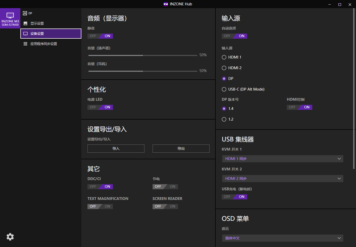 INZONE M3和INZONE M9风格基本保持一致,整个操作也是遥杆的左右移动和上下选择,十分的方便,当然这些功能也可以通过专门开发的INZONE Hub进行设置,INZONE Hub也接管了整个显示器的固件升级。
