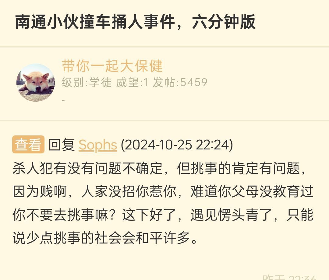 这是很明显的模糊相关性的逻辑谬论,要追溯因果链,两个事件是必须具有高度因果联系的,嘴臭嘲讽到持刀伤人,这里面不具备相关性,因此不能构成因果条件,否则按这个理论可以无限追溯下去,持刀者在群里邀约炸街是不是罪魁祸首?他买SU7是不是罪魁祸首?4S店卖给他是不是罪魁祸首?雷军造SU7是不是罪魁祸首?他爸妈把他生下来是不是罪魁祸首?可以一直追溯到宇宙大爆炸(都是世界的错