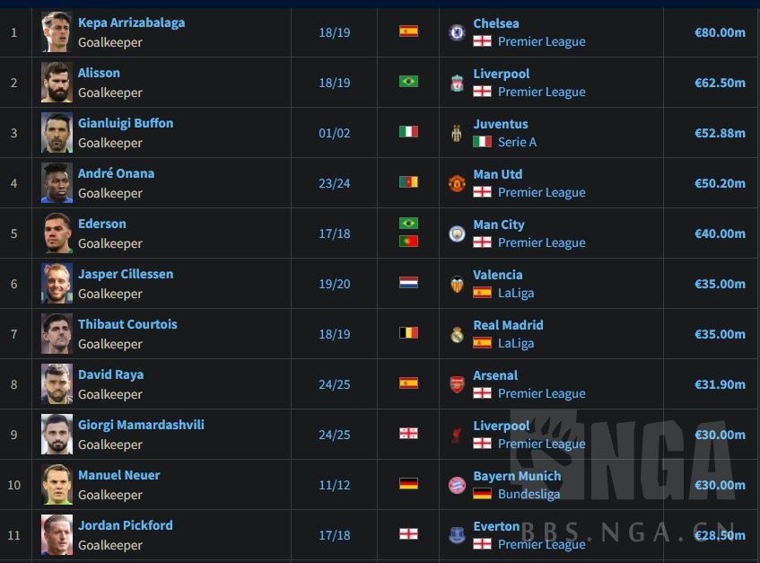 门将这个位置的特殊性 导致其身价跟转会费都拉不开差距