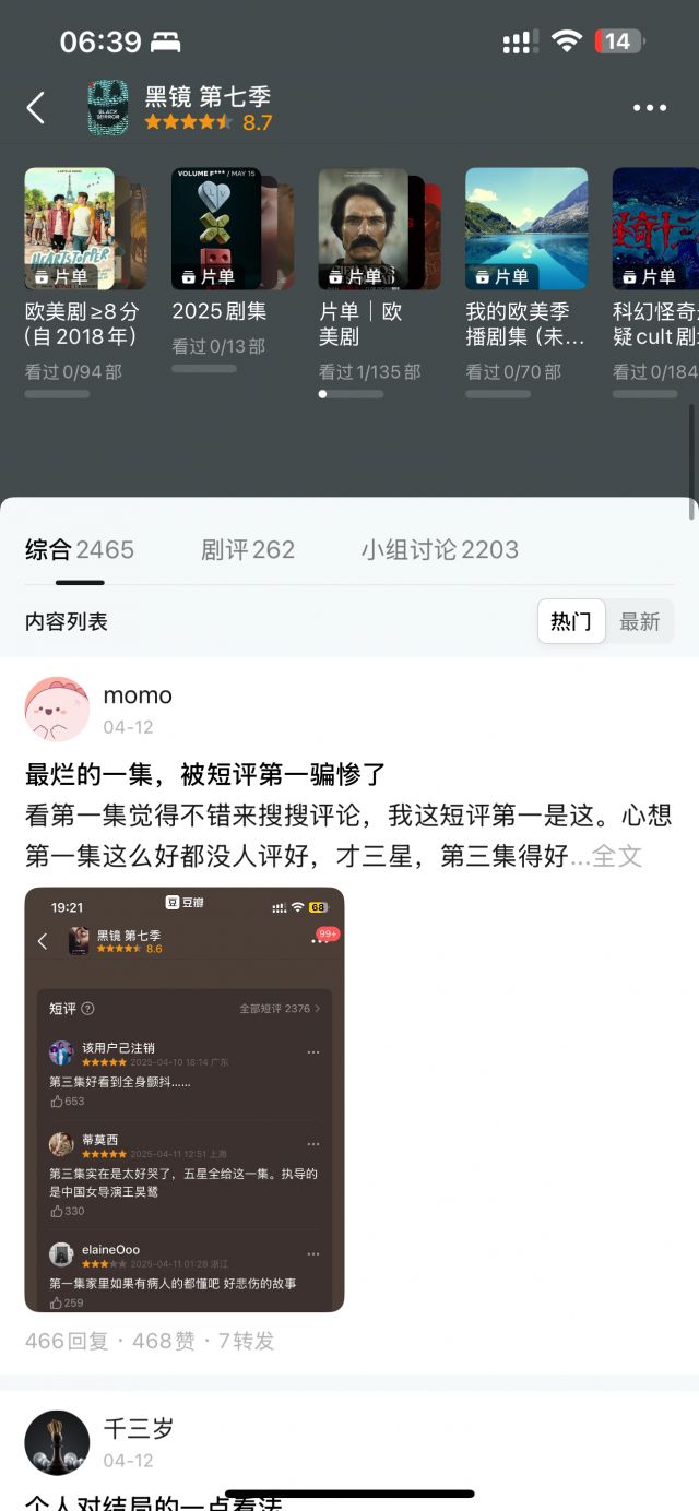 就比如说黑镜s7第三集是个女导演拍的,豆瓣上无脑吹上天,我还以为有多好结果也就一般般,一看IMDB就数这集评分最低。然后豆瓣就开始甩锅国外老白男反DEI反过头,恶意打低分