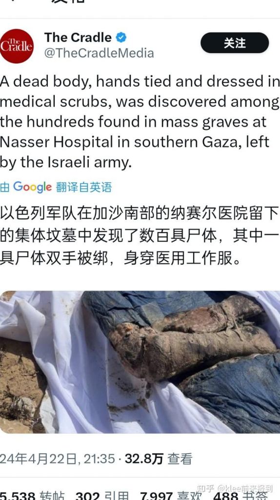 加沙地带民防部门还称,遗体中的一部分并非正常死亡,在被发现时,他们双手双脚被绑。(央视)[加沙一医院发现超310具遗体,部分遗体双手双脚被绑-哔哩哔哩] [https://b23.tv/j5C20Yn https://b23.tv/j5C20Yn]▸