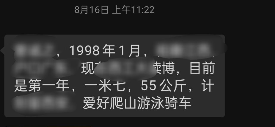 其实我想感叹的是,我侄女条件一般吧,也就是普本独生女工人家庭,居然可以介绍到这么多高学历的年轻男青年,而且都是她pass别人 ,看来女本科=男硕士,女备考=男编制,并不是空话。