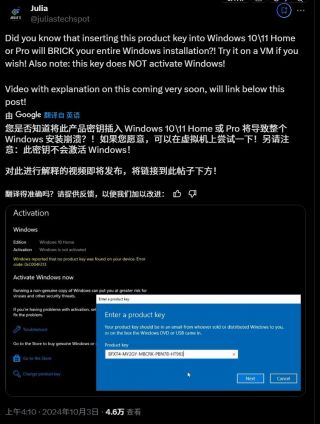 您是否知道将此产品密钥插入 Windows 10\11 Home 或 Pro 将导致整个 Windows 安装崩溃?!如果您愿意,可以在虚拟机上尝试一下!另请注意:此密钥不会激活 Windows!