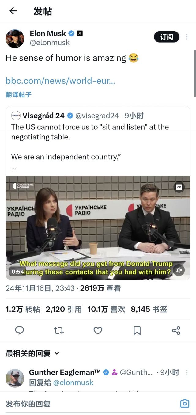 当地时间11月16日,美国当选总统特朗普的亲密顾问、亿万富豪马斯克在X平台上转发了一则关于“泽连斯基称乌克兰是独立国家,美国不能强迫其坐在谈判桌上倾听”的消息,并表示,“他的幽默感令人惊叹。”