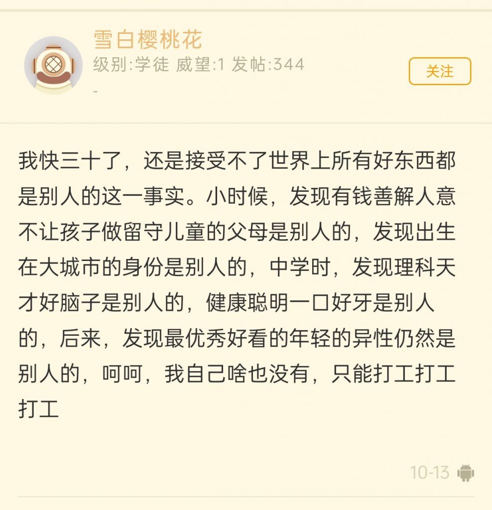 刚才在被窝里抽泣,一直不停,我问她为啥哭这么伤心,结果她支支吾吾,最后终于说她哭的是自己不服气,凭啥她一出生不是北京人上海人东京人而是一个河南人。。。