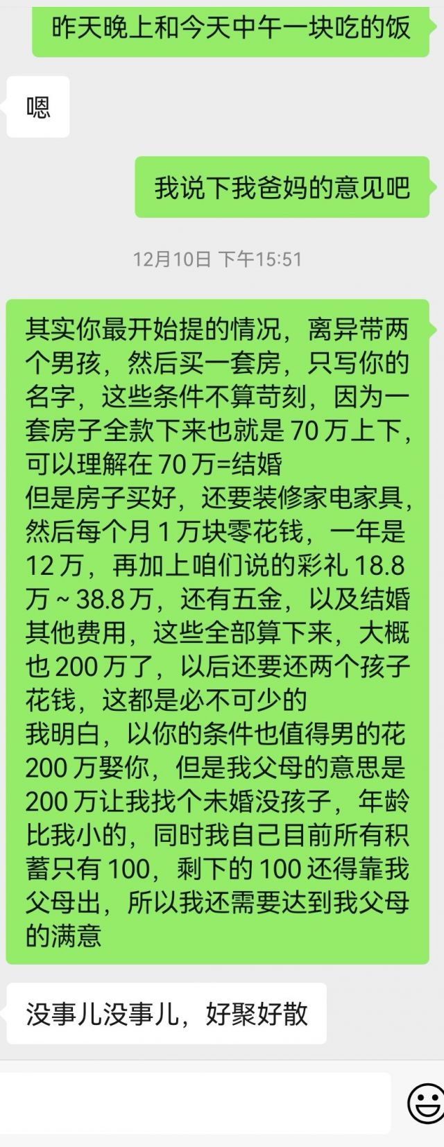 目前手头只有100万的积蓄,实在娶不起,除非问爸妈再要100万,我爸妈的意思是200万还不如找个未婚没娃的,实在没办法,分手了