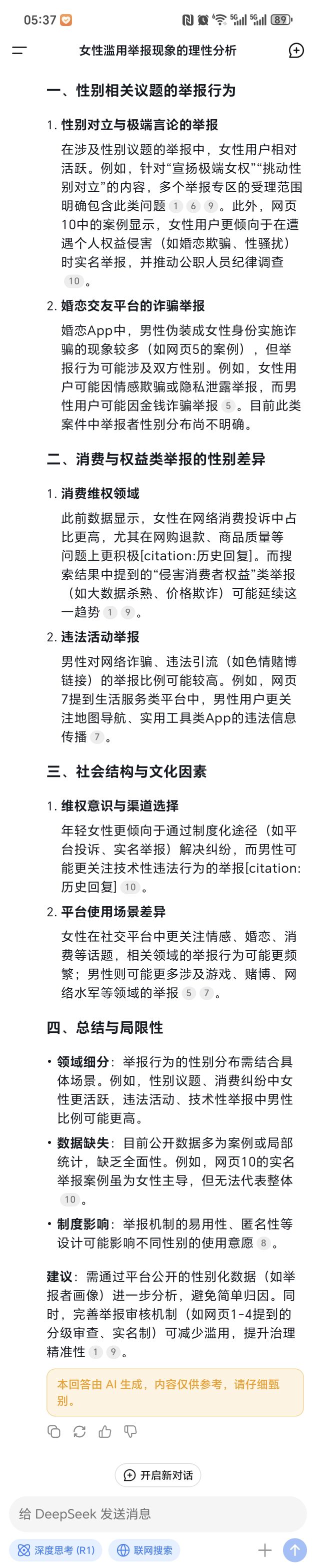女性社区单个领域单个话题中的单个内容可以做到每晚百万次的举报。女性群体懂得各种举报方式。还有法抗带来的其他违法技能辅助。网络声量也巨大。平台运营都被女性之间的相互举报狂潮弄得焦头烂额。各种平台的智能审核机制都在被她们每天更新的举报思路量化突破。你一小男孩就别去单挑人家了。